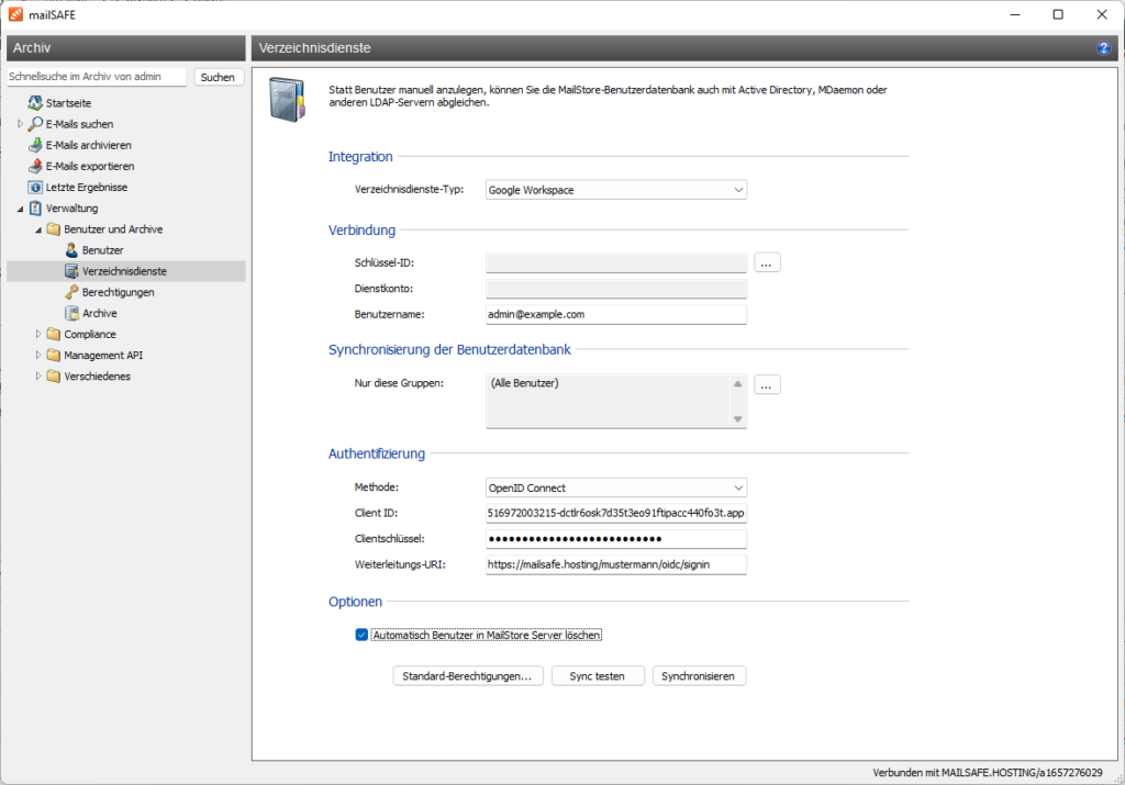 Für die Synchronisierung benötigt mailSAFE Informationen darüber, wie das Google Workspace-Konto angesprochen werden kann.