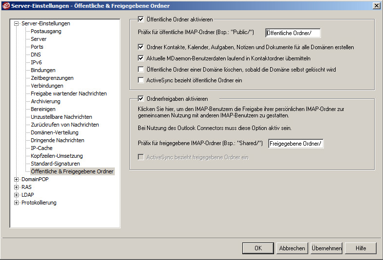Öffentliche Ordner werden im MDaemon Email Server innerhalb der Benutzerpostfächer in einem vom Administrator vorgegebenen Ordner angezeigt. Deren Namen werden in den Server-Einstellungen konfiguriert.