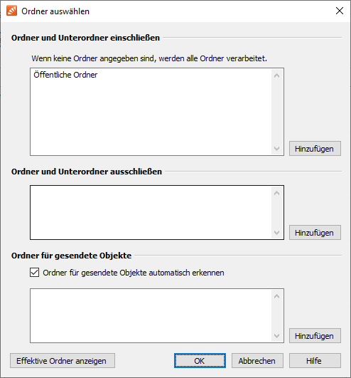 - Fügen Sie den Namen der öffentliche Ordner Ihres MDaemon Email Servers im Bereich Ordner und Unterordner einschließen hinzu. Standardmässig ist der Name Öffentliche Ordner.