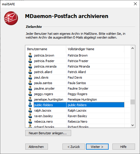 - Sie haben nun die Möglichkeit, die Benutzer auszuwählen, deren Postfächer archiviert werden sollen.