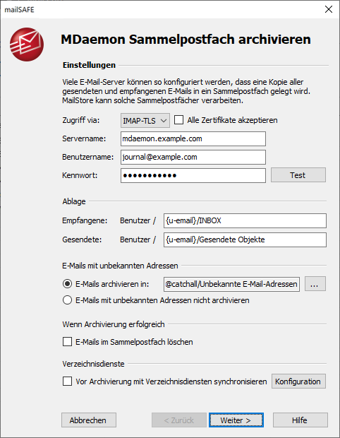 Der MDaemon Email Server bietet eine einfache Möglichkeit, alle E-Mails in ein MDaemon-eigenes Sammelpostfach zuzustellen. Aus diesem MDaemon-Sammelpostfach lässt sich dann mit Hilfe einer Archivierungsaufgabe vom Typ IMAP-Sammelpostfach die Archivierung mit mailSAFE durchführen.
