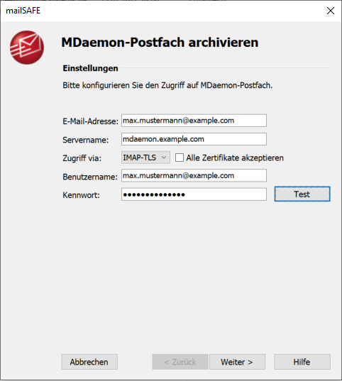 - Füllen Sie die Felder E-Mail-Adresse, Servername, Zugriff via, Benutzername und Kennwort aus. Sie können die Angaben über die Schaltfläche Test überprüfen.
