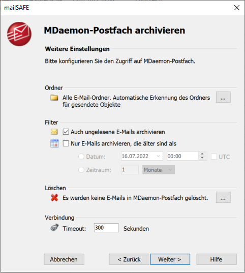 - Passen Sie bei Bedarf die Liste der zu archivierenden Ordner, den Filter und die Löschoptionen an. Standardmässig werden keine E-Mails aus einem Postfach gelöscht. Der Timeout-Wert muss nur im konkreten Bedarfsfall (z.B. bei sehr langsam reagierenden Servern) angepasst werden.