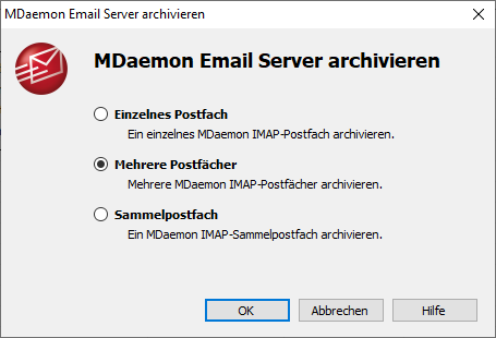 mailSAFE bietet unterschiedliche Methoden an, um E-Mails aus MDaemon Email Server-Postfächern zu archivieren, welche im Folgenden beschrieben werden. Sollten Sie sich nicht sicher sein, welche der möglichen Archivierungsmethoden für Ihr Unternehmen die passende ist, empfehlen wir Ihnen das Kapitel Auswahl der richtigen Archivierungsstrategie.