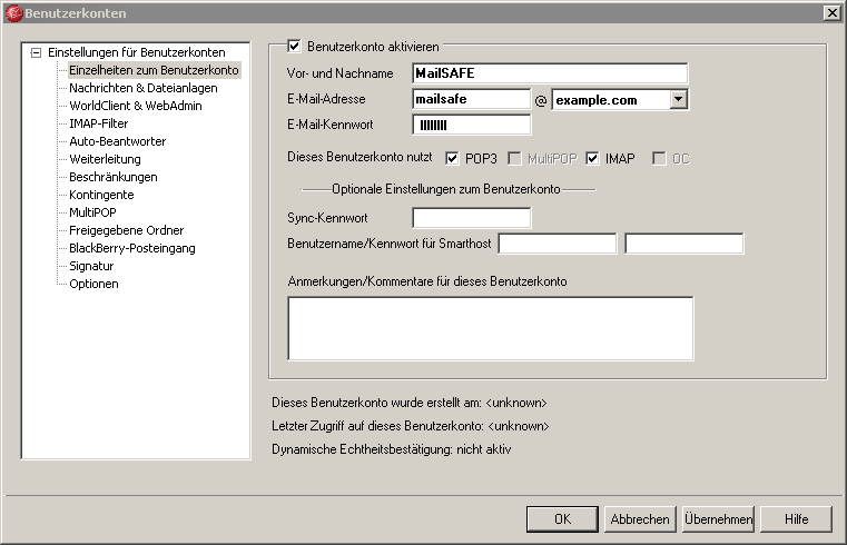 - Erstellen Sie ein neues Postfach. Im folgenden Screenshot sehen Sie eine Beispielkonfiguration für das Postfach mailsafe@example.com