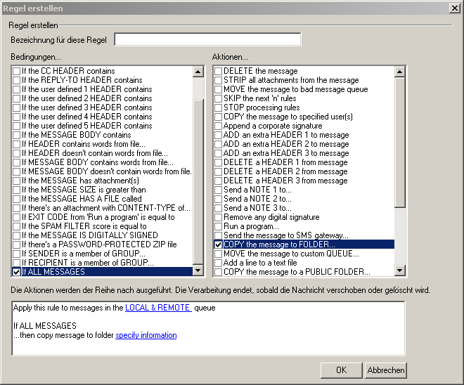 - Aktivieren Sie unter Bedingungen... die Bedingung If ALL MESSAGES und aktivieren Sie unter Aktionen... COPY the message to FOLDER....
