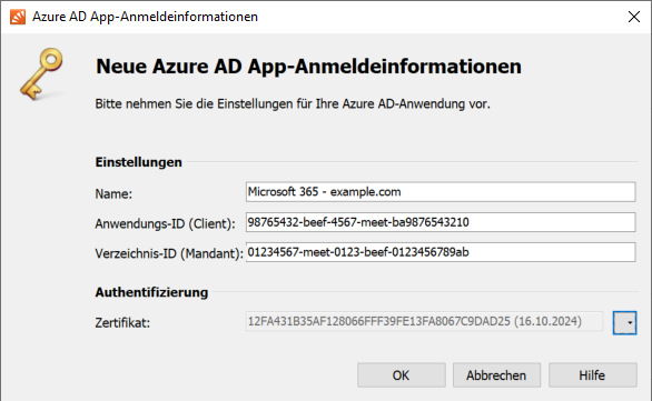 Anmeldeinformationen für Microsoft 365 bestehen aus den eben erstellten IDs und einem Geheimnis, mit dem mailSAFE seine Identität gegenüber Azure AD ausweist. Microsoft empfiehlt die Verwendung von Zertifikaten als Geheimnis zur Identifizierung einer App in Azure AD. Ein solches Zertifikat wird beim Erstellen von Anmeldeinformationen automatisch von mailSAFE erzeugt, kann aber auch nachträglich erneut generiert werden.